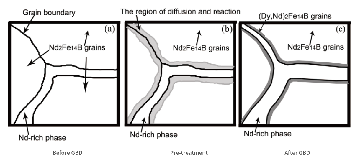 Grain boundary diffusion technology is to form a thin layer of Dy or Tb heavy rare earth on the surface of sintered NdFeB magnet sheet with thickness of 1-9mm by surface coating, magnetron sputtering, vacuum evaporation and electrophoretic deposition.After proper heat treatment and tempering treatment, the intrinsic coercivity of the magnet is greatly improved.It can reduce the use of heavy rare earths material, thereby reduce manufacturing costs. It can also produce high- performance magnet that can't produced by normal processes.
